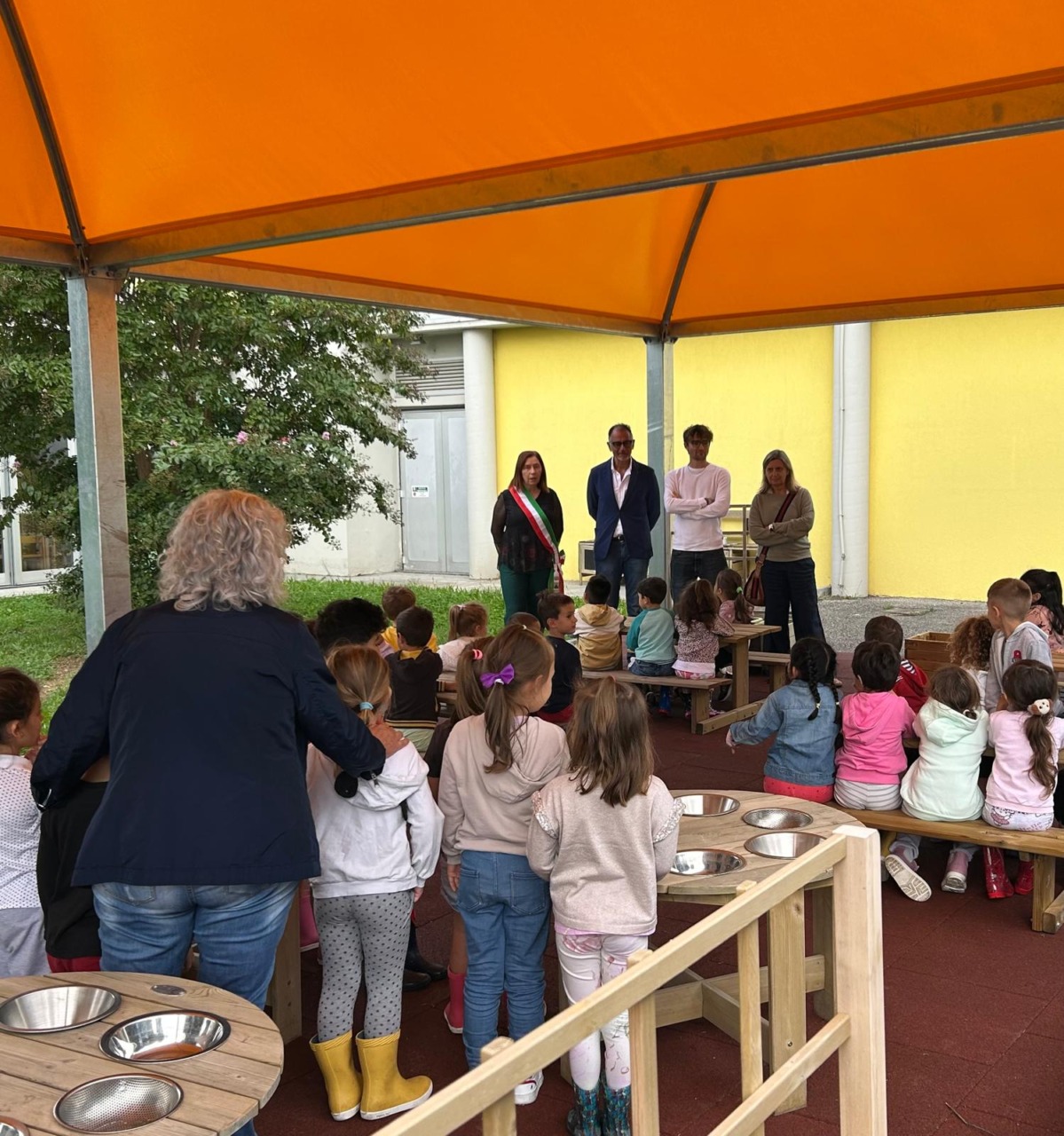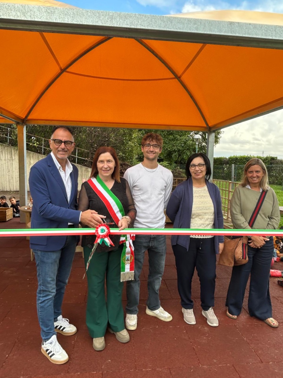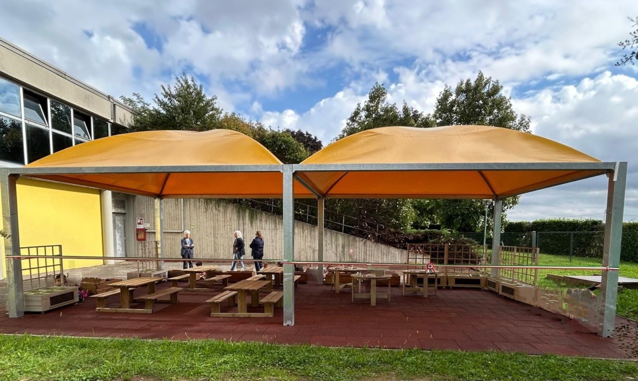 Taglio del nastro per la copertura dell’aula all’aperto alla scuola dell’infanzia di Basiano. La cerimonia è avvenuta ieri mattina, mercoledì 24 settembre 2025 alla presenza del dirigente scolastico Raffaele Di Maro, di una rappresentanza della componente genitori del Consiglio d’Istituto, dell’assessore alla Pubblica istruzione Daniele Ciocca e del sindaco Stefania Solcia. I bambini, che hanno partecipato alla cerimonia, hanno accolto incuriositi il nuovo spazio che sarà utilizzato per attività propedeutiche all’aria aperta. L’Istituto comprensivo aveva ottenuto gli arredi, banchi, fioriere, tavoli per travasi, attraverso un finanziamento, con l’Amministrazione comunale che, con 20mila euro, ha realizzato la copertura in acciaio zincato con telo in Pvc ignifugo, completando l’opera con la posa di una pavimentazione antitrauma. L’intervento segue quello della riqualificazione della pavimentazione esterna dell’asilo nido, realizzata a maggio.