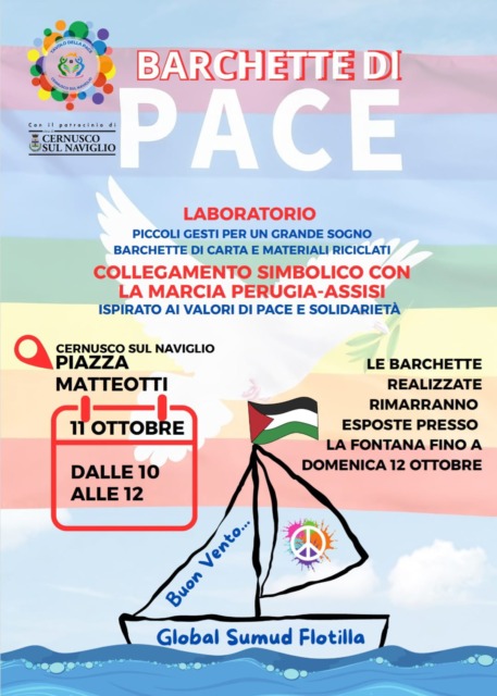 Il Tavolo della Pace di Cernusco sul Naviglio, con il patrocinio del Comune, organizza per sabato 11 ottobre 2025 un laboratorio denominato “Barchette di Pace”. L’iniziativa si terrà in Piazza Matteotti, dalle 10 alle 12.