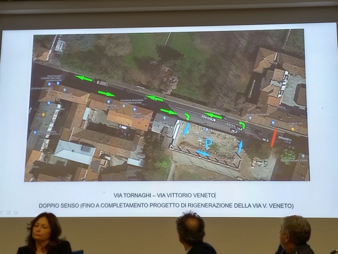 Un tratto di via Veneto sarà percorribile in un solo senso, mentre l’altra corsia (ridisegnata) verrà dedicata ai mezzi pubblici. Questo per sfruttare gli spazi in modo da ricavare delle “isole” che potranno ospitare dehors o altro arredo. L’andamento a onde della strada è voluto per costringere i veicoli, che condivideranno lo spazio con i ciclisti, a rallentare. Saranno abbattute le barriere architettoniche e verrà creata unitarietà tra la sede del Comune e la chiesa parrocchiale. Ridurre l’area per il transito è una scelta volta a favorire la socialità.