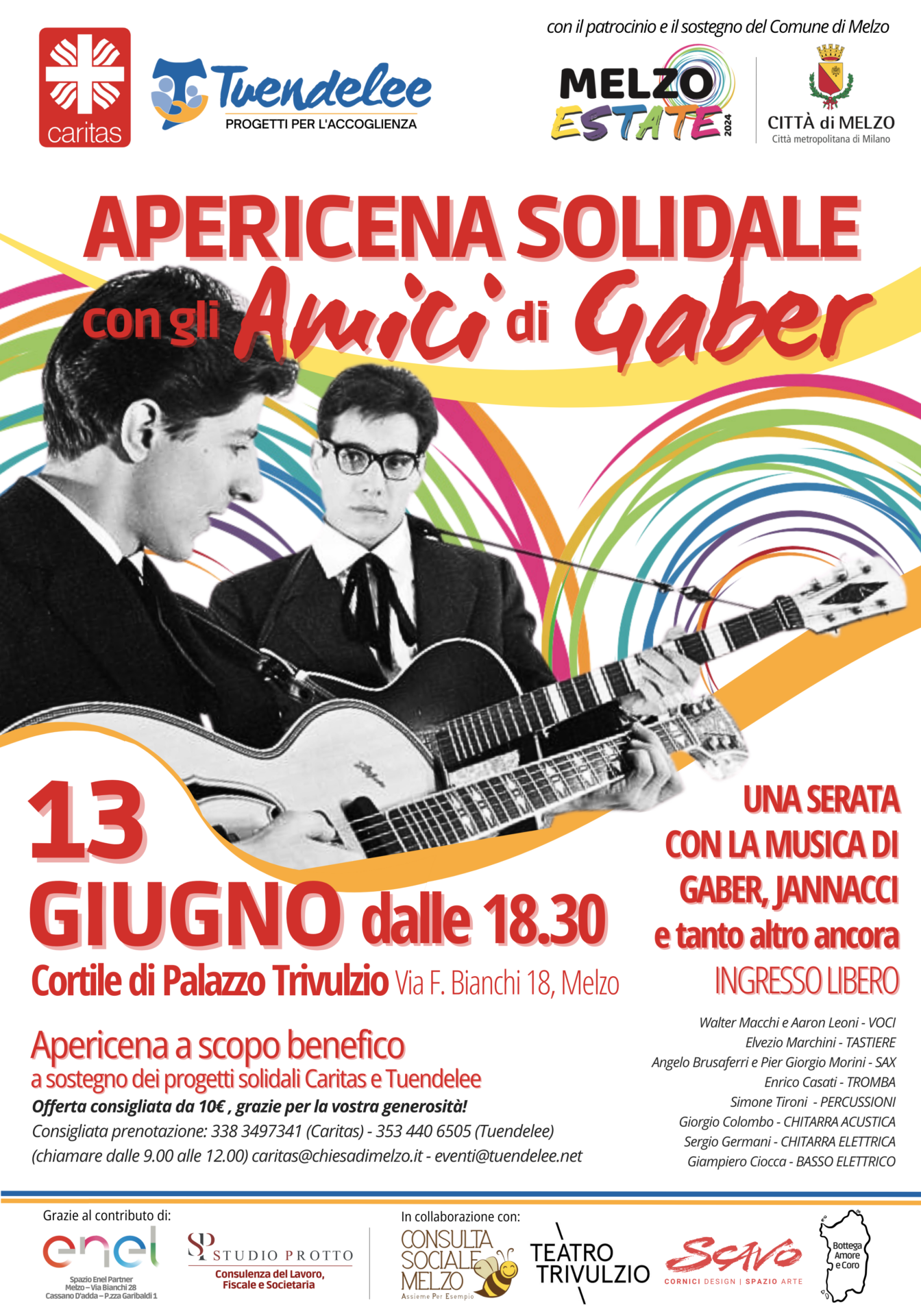 L’appuntamento è giovedì 13 giugno a partire dalle 18.30 presso il cortile interno di Palazzo Trivulzio (ingresso da via Bianchi) dove si terrà un apericena organizzato dai sodalizi melzesi e, a seguire, il concerto della band “Gli amici di Gaber”.