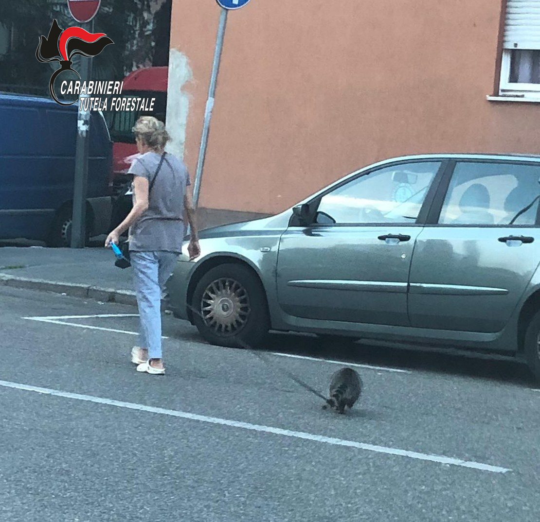 A passeggio con un procione al guinzaglio: animale sequestrato. Intervento dei Carabinieri Forestali: la specie è considerata pericolosa e non può essere detenuta da privati.