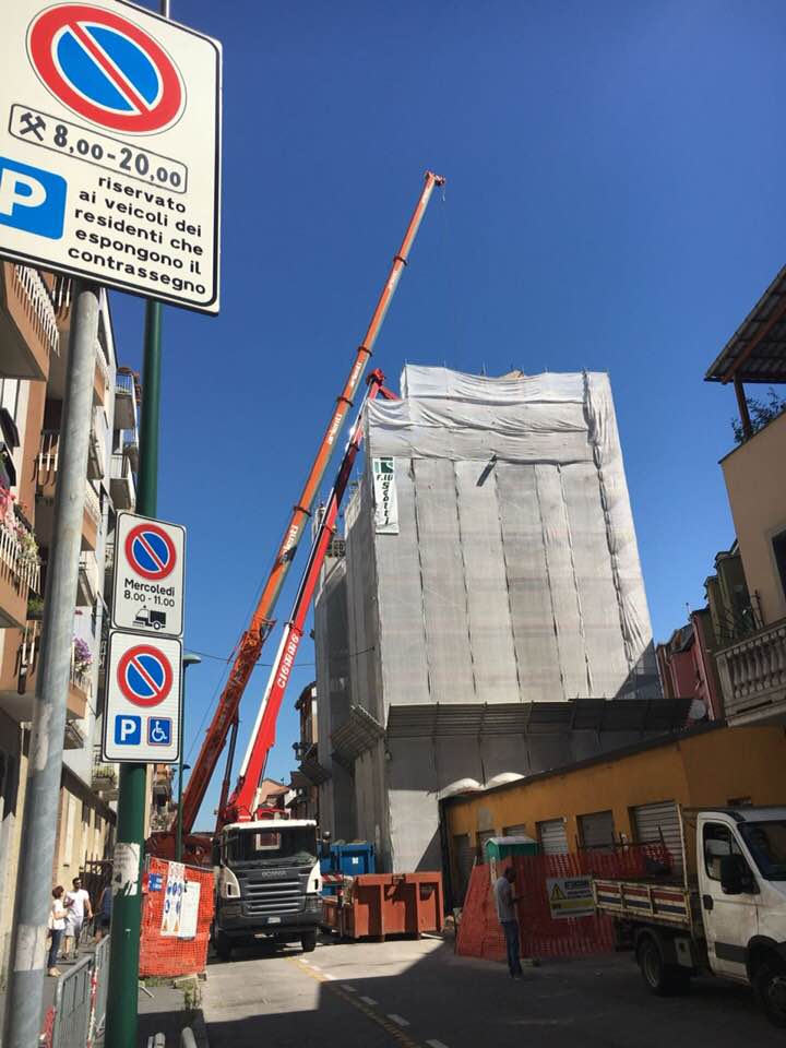 Giovedì, quello che rimaneva del quinto piano della palazzina nel rione Vittoria è stato definitivamente rimosso. Ad assistere alle operazioni di cantiere anche l’assessore all’Urbanistica Antonio Lamiranda, che ha sottolineato come il cronoprogramma sia stato per ora rispettato alla lettera.