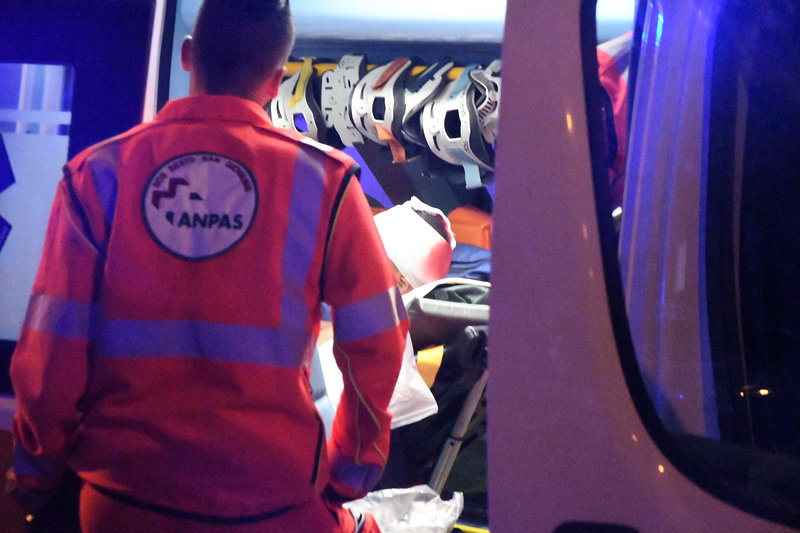 Il 20enne nell’ambulanza, con la vistosa fasciatura alla tesa (Foto Daniele Bennati)