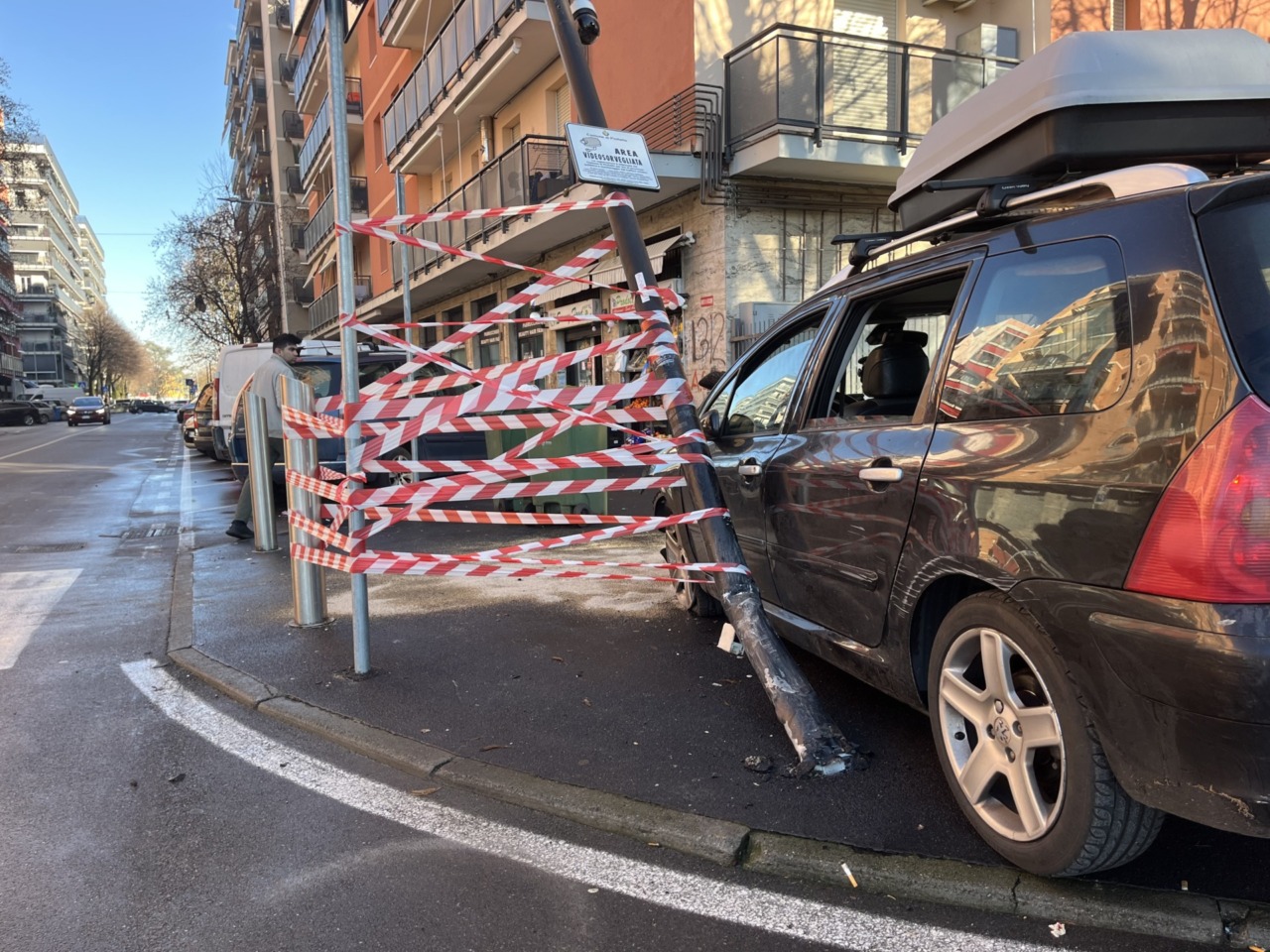 L’urto è stato violento, tanto da danneggiare seriamente la parte anteriore sinistra del veicolo e inclinare pericolosamente il palo in cima al quale si trovano le telecamere di videosorveglianza. Alla fine ha retto. Ma se fosse crollato al suolo al passaggio di un pedone, l’esito dell’incidente avrebbe potuto essere ben più grave.