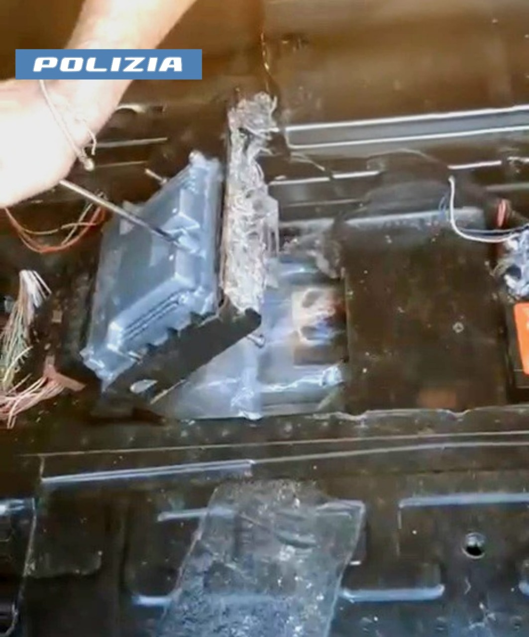 A seguito del controllo, i poliziotti hanno scoperto un sofisticato doppiofondo artigianale nel bagagliaio dell’auto, nascosto da una modifica tecnica con un meccanismo di apertura innestato su una centralina elettrica fittizia collegata all’impianto dell’auto, utilizzata per occultare la sostanza stupefacente. All’interno del vano segreto sono stati rinvenuti e sequestrati 5 panetti di cocaina per un peso complessivo di 5.748 grammi che, se venduta al dettaglio dopo il taglio, porterebbe a profitti illeciti fino al milione di euro.