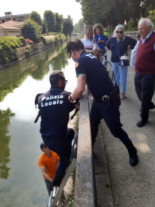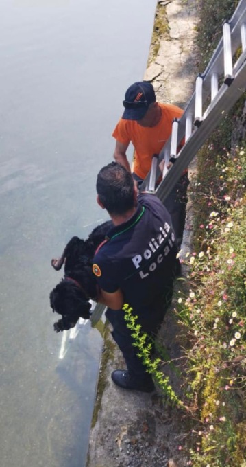 Mentre camminava è caduto. Subito dopo un agente della Polizia Locale, che era stata allertata da una passante, è sceso nel greto del canale ed è entrato in acqua recuperando il cane e traendolo in salvo.