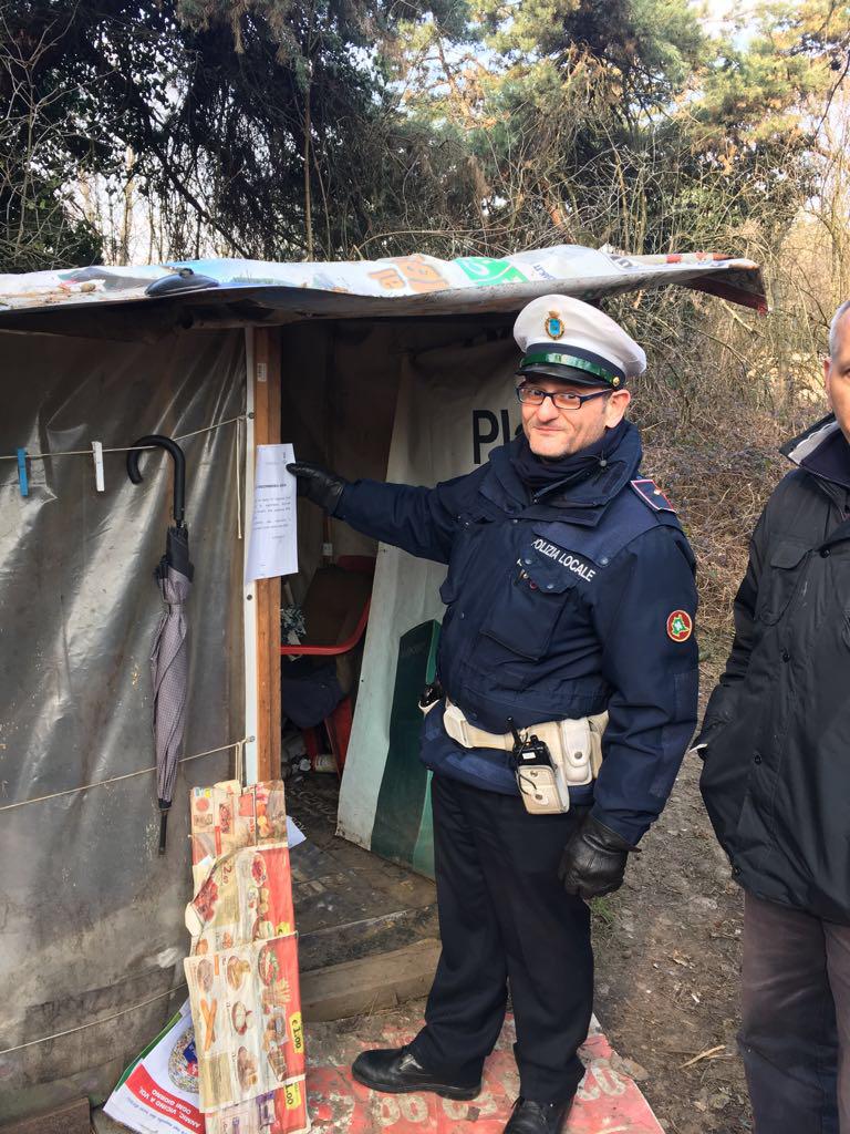 La Polizia locale durante lo sgombero delle baracche in via Deledda