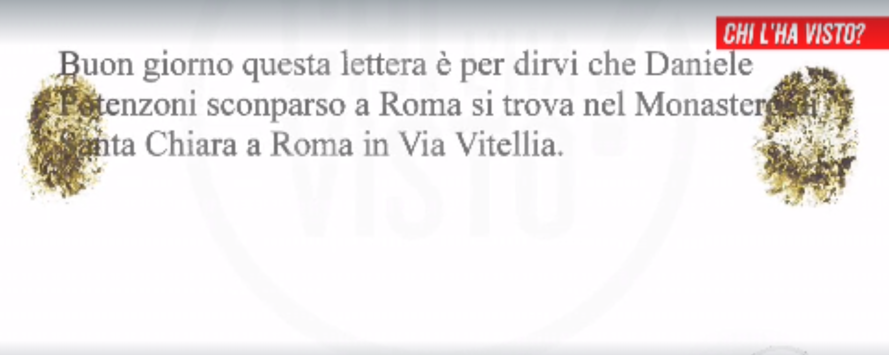 “Daniele si trova nel monastero di Santa Chiara in via Vitellia a Roma”. Così una lettera anonima ha allertato la trasmissione “Chi l’ha visto?”, che da anni segue la vicenda del pantigliatese, scomparso quando aveva 36 anni mentre con un gruppo di altri disabili si apprestava a partecipare a un’udienza con il Papa.