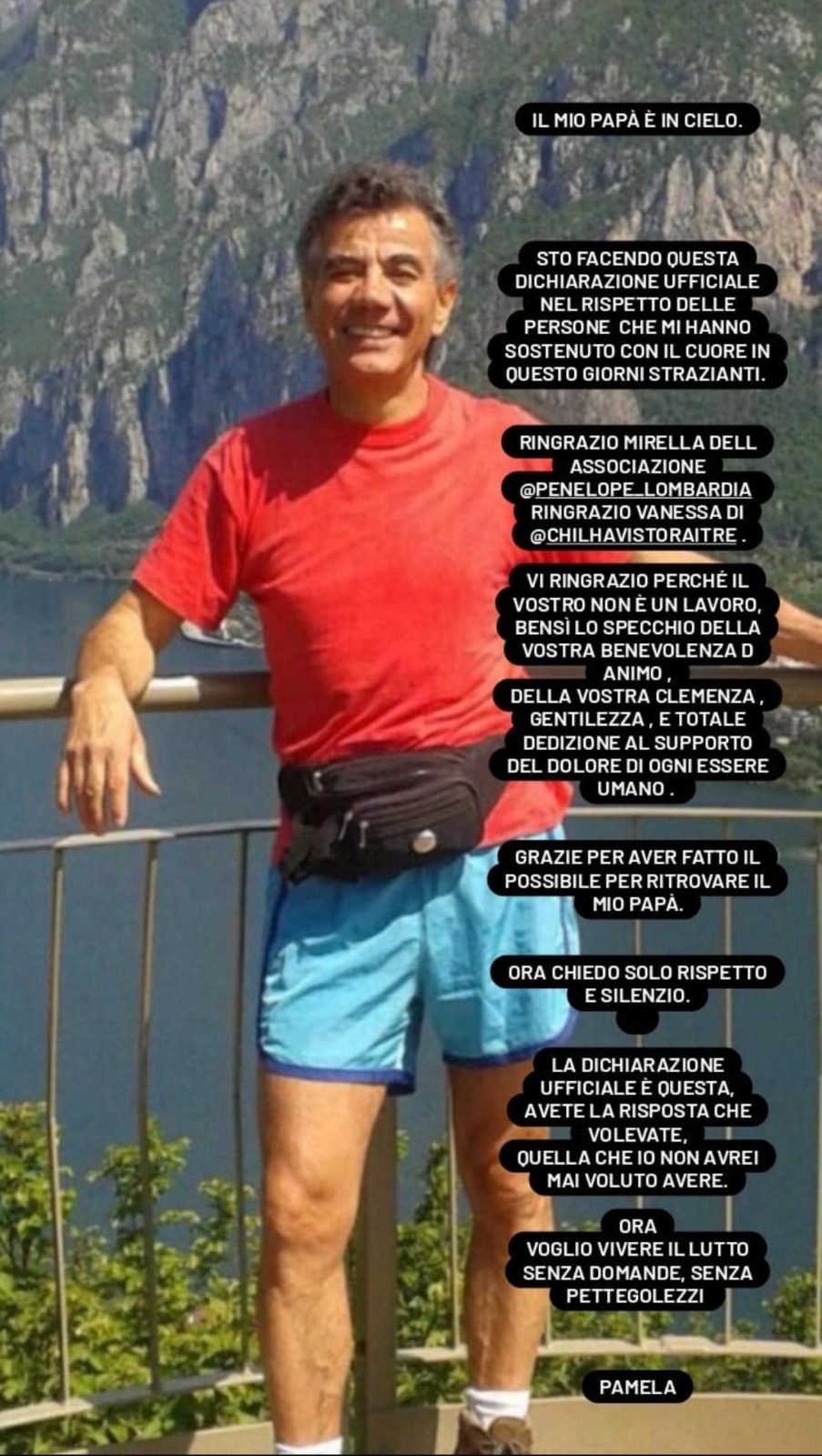 A confermarlo è la stessa figlia di Magnani, Pamela, che ha affidato il proprio dolore ai Social: “Il mio papà è in cielo – scrive – Faccio questa dichiarazione ufficiale nel rispetto delle persone che mi hanno sostenuto con il cuore in questi giorni strazianti. Ringrazio Mirella dell’associazione Penelope Lombardia e Vanessa di “Chi l’ha visto”. Vi ringrazio perchè il vostro non è un lavoro, bensì lo specchio della vostra benevolenza d’animo, della vostra clemenza, gentilezza e totale dedizione al supporto del dolore di ogni essere umano. Grazie per aver fatto il possibile per ritrovare il mio papà. Ora chiedo solo rispetto e silenzio”.