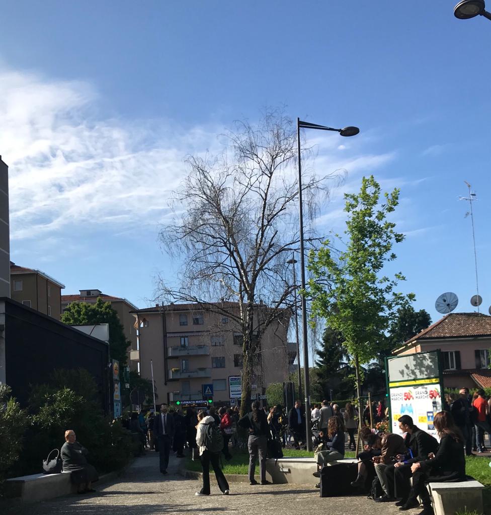 I pendolari in attesa dei bus sostitutivi in fondo a viale Assunta di Cernusco, prima dell’incrocio con la Padana