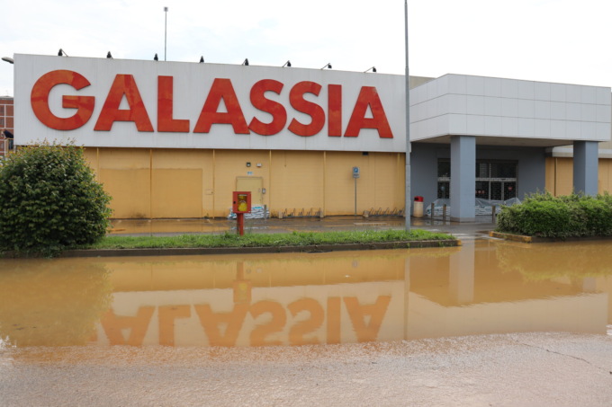 Alle 7 di questa mattina, giovedì 16 maggio 2024, persino il piazzale del supermercato Galassia si era trasformato in un lago di fango. L’acqua è penetrata all’interno del punto vendita, allagando i corridoi. A poco sono serviti i sacchi di sabbia posizionati di fronte alle porte, non riuscendo a reggere l’impatto con l’acqua.