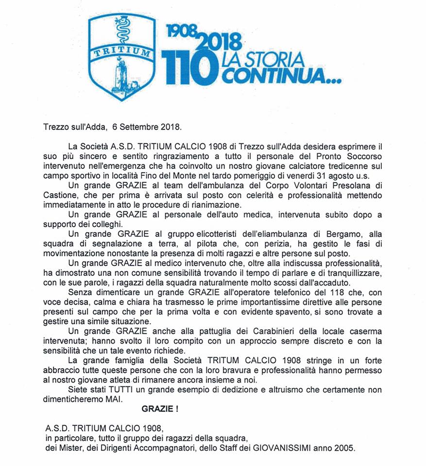 “L’Asd Tritium Calcio 1908 desidera esprimere il suo più sincero e sentito ringraziamento a tutto il personale del Pronto soccorso, intervenuto nell’emergenza che ha coinvolto il nostro calciatore sul campo sportivo di Fino del Monte”. Inizia così il comunicato appena emesso dalla società trezzese.
