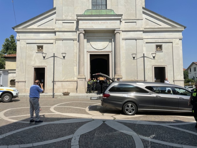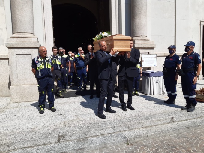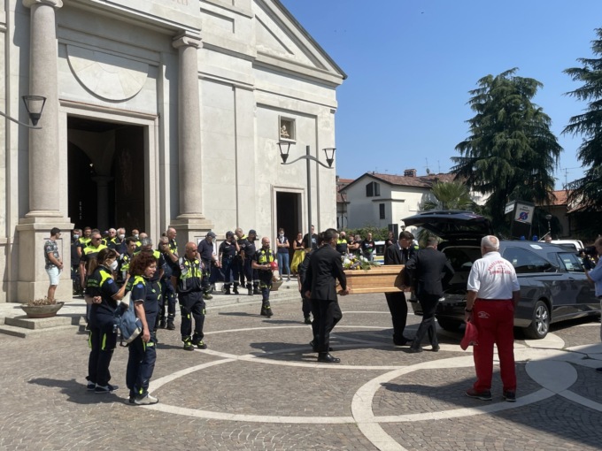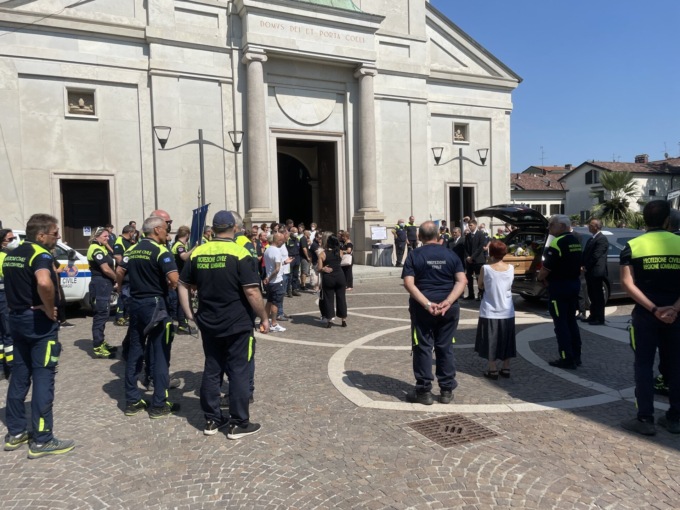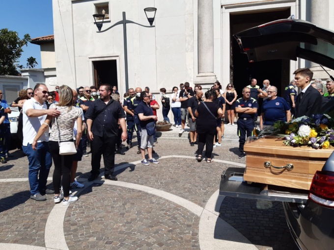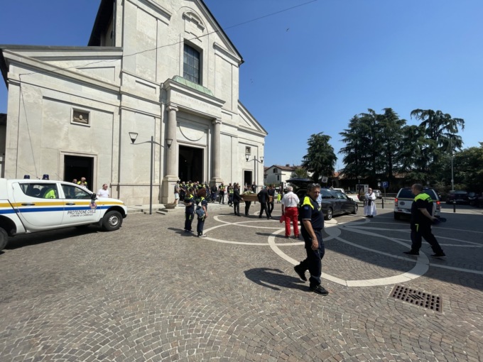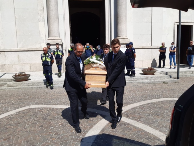 Al termine della funzione religiosa, una grande folla di cittadini e volontari si è raccolta intorno al piazzale, tra lacrime e abbracci. I mezzi della Protezione civile hanno messo in funzione le sirene fino all’arrivo della bara, che è poi stata scortata al cimitero del Paese.