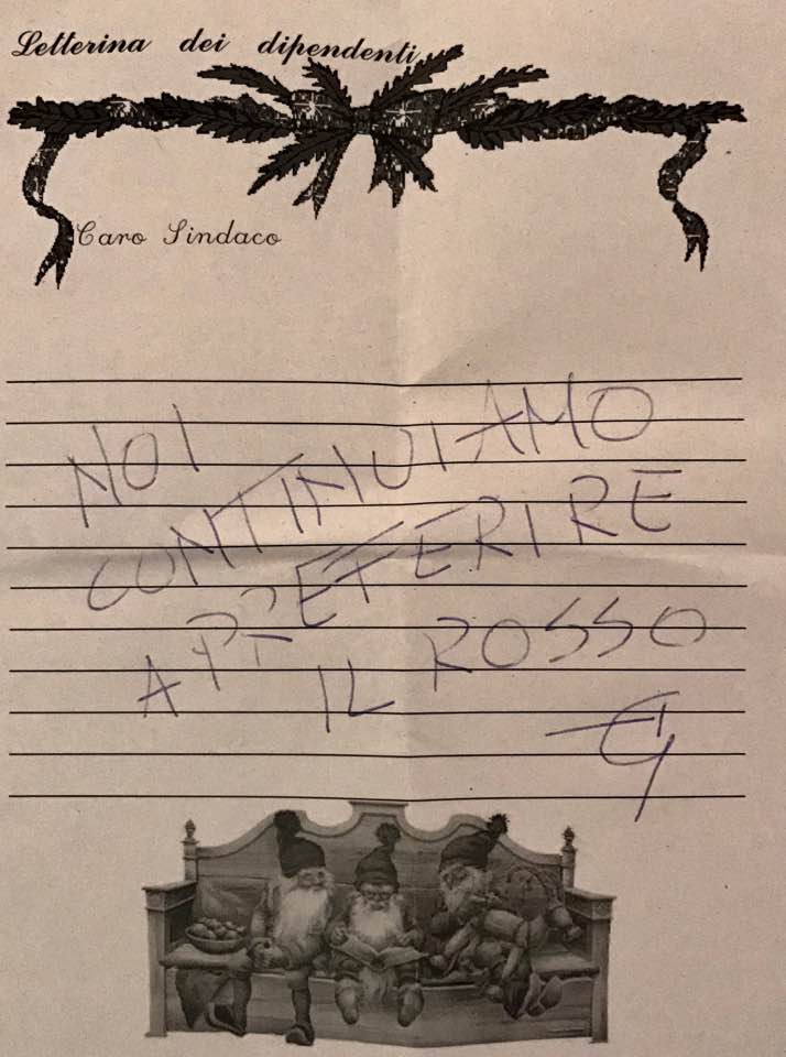 Non solo questa lettera. Di Stefano ne ha pubblicata un’altra, scritta da un dipendente pubblico che pare non aver gradito l’illuminazione azzurra del Municipio per il Natale. “Noi continuiamo a preferire il rosso”, con tanto di falce e martello disegnata a penna.