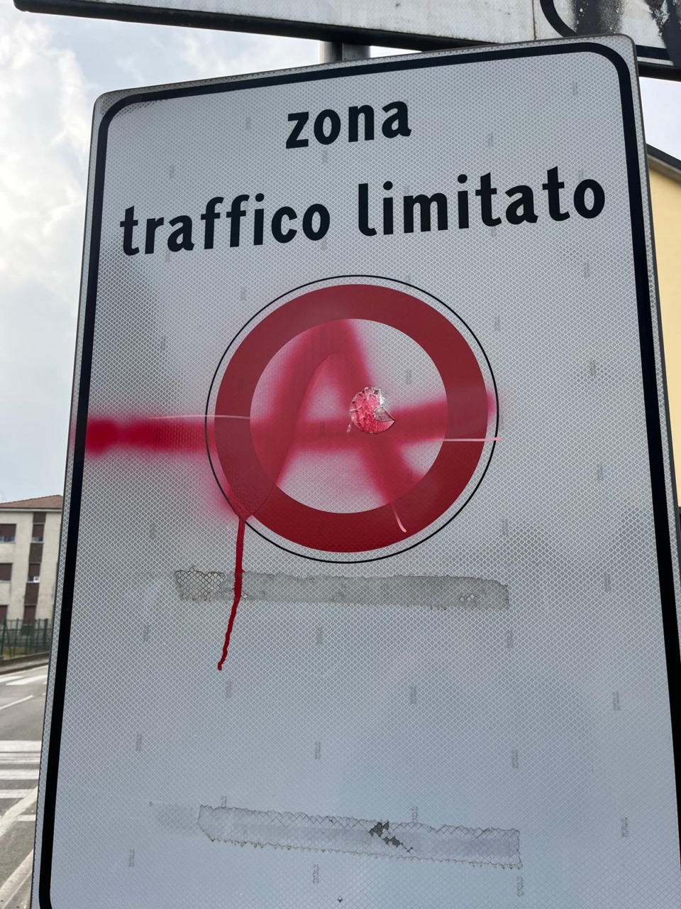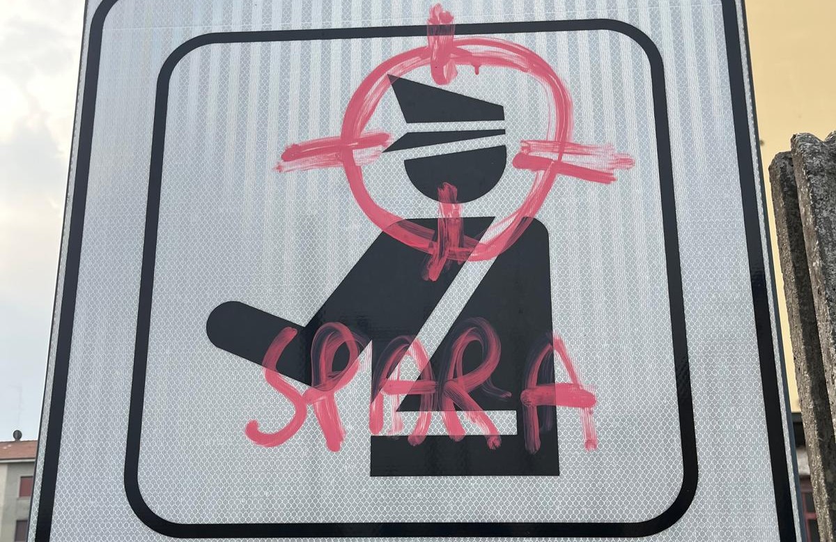 Il disegno di un mirino sul cartello stradale che segnala i controlli sulla velocità. E la parola “spara”, che purtroppo parla da sé, scritta con un grosso pennarello rosa, accompagnata da una A cerchiata (rossa, simbolo anarchico). Che potrebbe essere una sorta di “rivendicazione” per il gesto e che è stata tracciata utilizzando il segnale di divieto di transito.