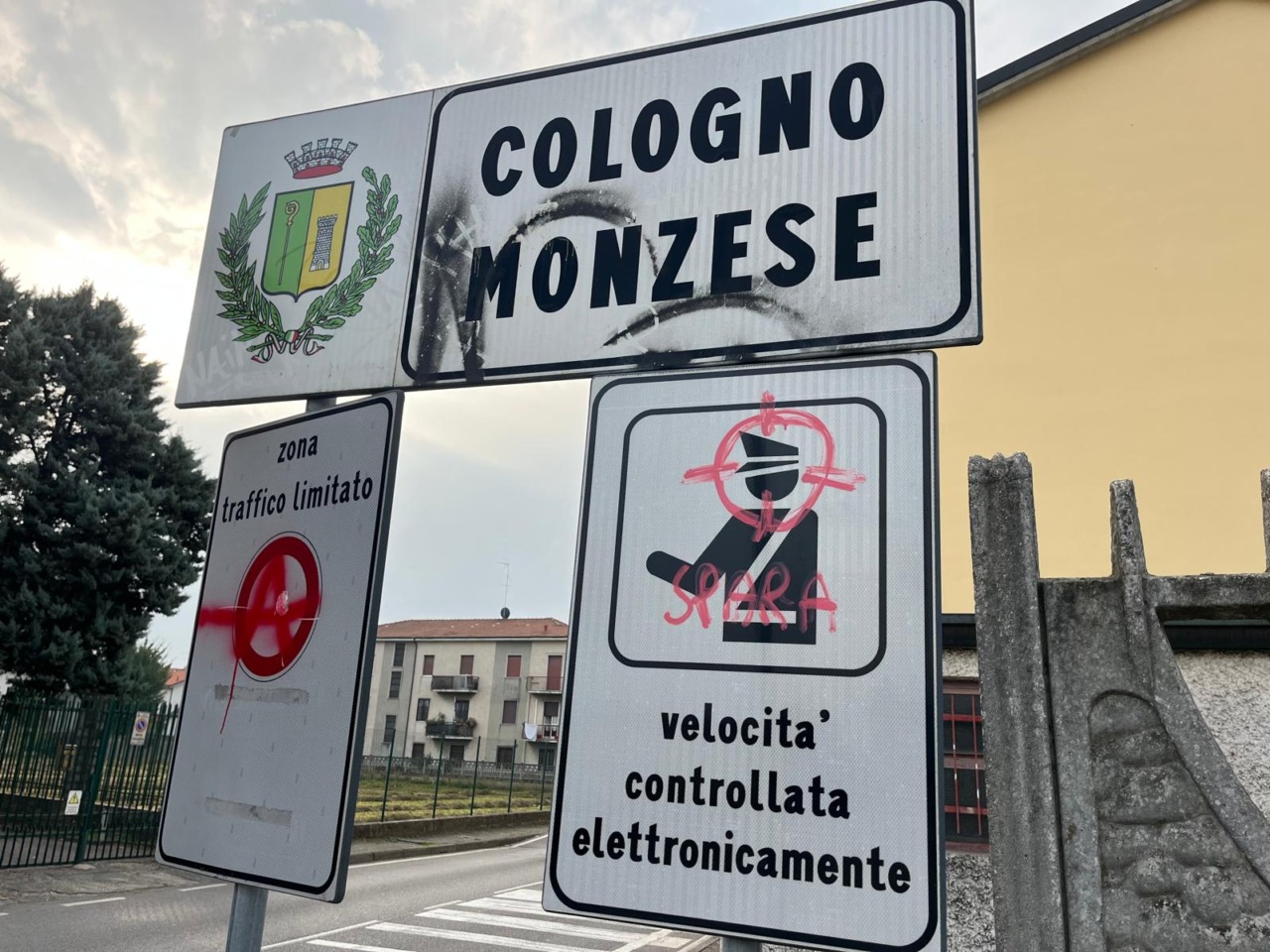 Pesanti minacce alle Forze dell’ordine sono apparse sulla segnaletica verticale di via per Monza, a Cologno Monzese, ai confini con Brugherio.