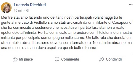 “Mentre stavamamo facendo uno dei tanti nostri partecipati volantinaggi tra la gente del mercato di Pioltello siamo stati avvicinati da un militante di Casa Pound che ha cominciato a sostenere che ricostruire il partito fascista non è reato, ripetendolo all’infinito. Poi ha cominciato a riprendere col telefonino un nostro militante per poi colpirlo con un pugno nello sterno. Un fatto vile che denota un clima intollerabile. Il fascismo deve essere fermato ora. Non ci intimidiranno, ma una democrazia sana deve espellere questi batteri tossici”.