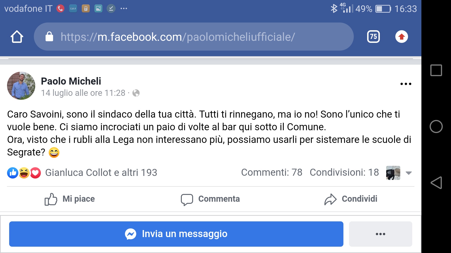 Il post pubblicato dal sindaco Paolo Micheli