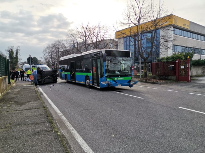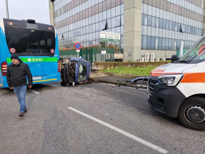 Incidente tra bus e auto questa mattina, venerdì 15 marzo 2024, a Cernusco sul Naviglio.