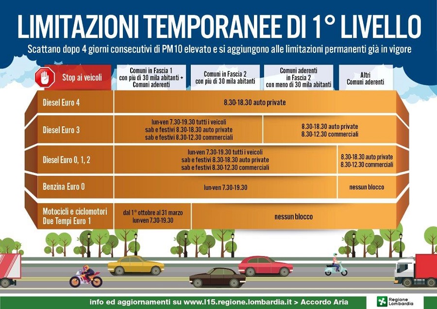 Lombardia, in attuazione dell’Accordo di Bacino padano. Le limitazioni riguarderanno i comuni coinvolti delle province di Milano, Monza e Brianza, Pavia, Lodi, Cremona e Mantova (comuni con più di 30 mila abitanti, oltre a quelli aderenti su base volontaria). Le misure temporanee riguardano il settore traffico (limitazioni per i veicoli fino a euro 4 diesel in ambito urbano, obbligo spegnimento motori in sosta), il settore riscaldamento domestico (limitazione all’uso di generatori a biomassa legnosa di classe inferiore alle 3 stelle, riduzione di 1 grado delle temperature nelle abitazioni) e agricolo (divieto di spandimento liquami zootecnici, divieto assoluto di combustioni all’aperto). È stato invece registrato il rientro al di sotto dei limiti per le province di Brescia e Bergamo, che non saranno pertanto interessate da provvedimenti temporanei. Le province di Varese, Como e Lecco confermano valori medi inferiori al limite.