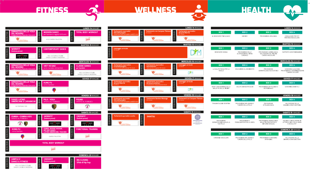 Sabato: 11-12 Zumba+Zumba Kids, 12-13 Wokfit (Start Body), 13-14 Cross Fit (Start Body),15-16 Kung Fu per bambini, 16-17 Zumba, Boodie Woogie, hip hop, dance latino americane, Thai box (Energy Palestra), 17-18 Functional Training (silos), 18-19 Total Body Workout (Silos Palestre).