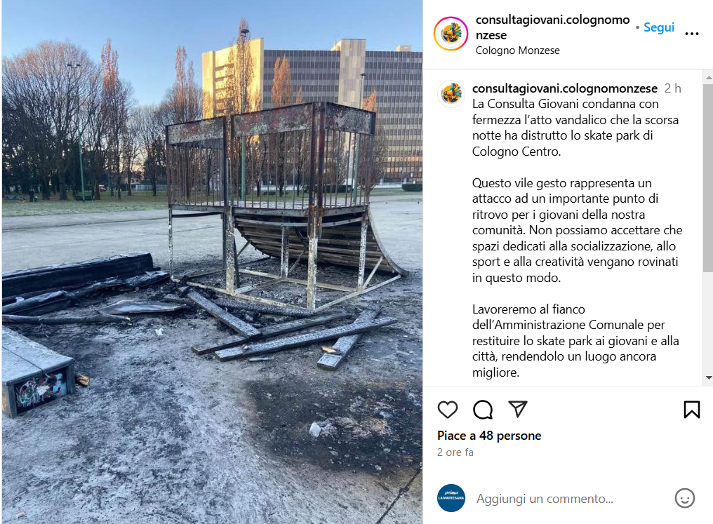 La Consulta Giovani condanna con fermezza l’atto vandalico che la scorsa notte ha distrutto lo skate park di Cologno Centro. Questo vile gesto rappresenta un attacco ad un importante punto di ritrovo per i giovani della nostra comunità. Non possiamo accettare che spazi dedicati alla socializzazione, allo sport e alla creatività vengano rovinati in questo modo.