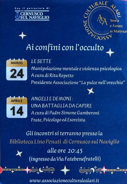 L’Associazione Culturale Alari, con il patrocinio del Comune di Cernusco sul Naviglio, presenta un nuovo e suggestivo ciclo di incontri dal titolo “Ai confini con l’occulto”. Un percorso culturale pensato per approfondire, con sguardo laico e scientifico ma anche con aperture alla dimensione spirituale, quei fenomeni complessi che interrogano l’essere umano tra psicologia, fede e mistero.