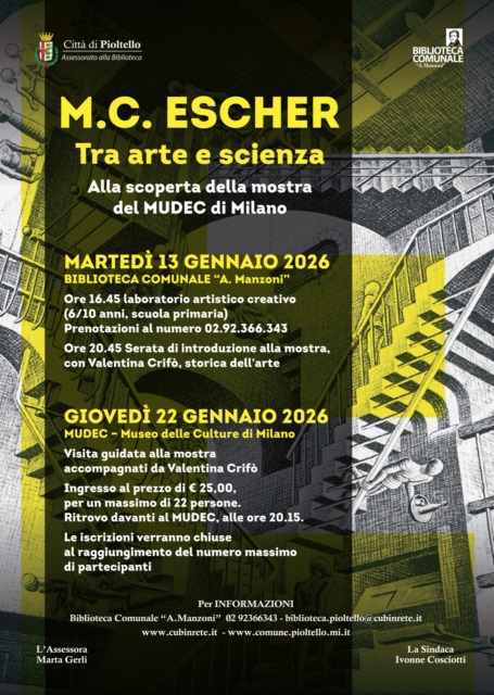 Una delle mostre che ha riscosso maggior successo al Mudec, il Museo delle culture, e che si appresta verso la sua conclusione. Per prepararsi al meglio a visitare l’esposizione “Tra arte e scienza” di M.C.Escher, l’Amministrazione pioltellese insieme alla biblioteca ha organizzato una serie di appuntamenti aperti a tutti.