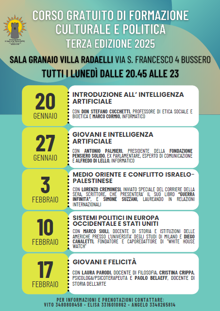 Prenderà avvio lunedì 20 gennaio 2025 la terza edizione del corso, tenuto presso la Sala Granaio di Villa Radaelli. Nel primo incontro, che si terrà dalle 20.45 alle 23 circa, si affronterà il tema dell’intelligenza artificiale. I temi che saranno affrontati nei cinque appuntamenti sono connessi, con un occhio di particolare attenzione per la cronaca e l’attualità. In veste di relatori saranno invitati esperti degli argomenti trattati.