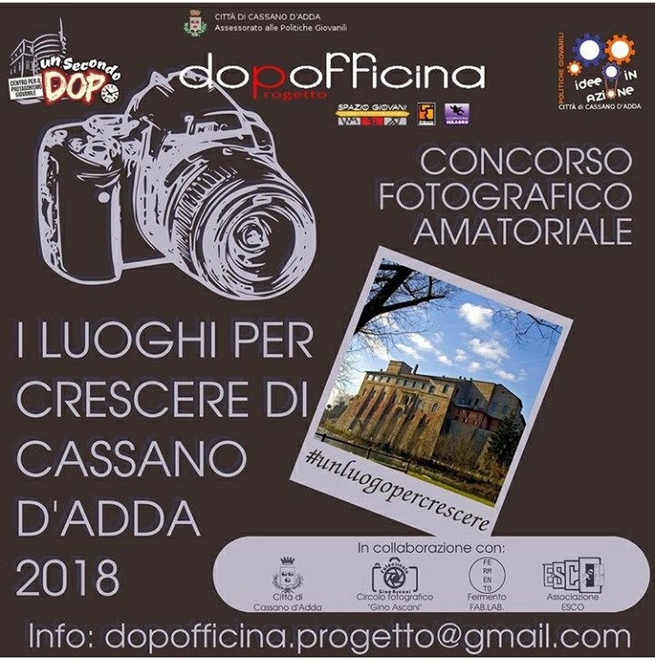 Dopofficina, progetto legato alle attività di Politiche giovanili di Cassano, in occasione della festa del paese ha organizzato un concorso fotografico dal titolo “I luoghi per crescere di Cassano d’Adda”. Possono partecipare tutti coloro che vogliono raccontare attraverso le immagini i luoghi che rappresentano momenti importanti e di crescita. L’obiettivo è raccontare la città utilizzando un punto di vista soggettivo e personale.