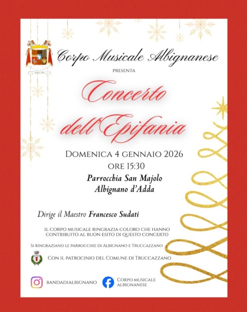 Domenica 4 gennaio 2026, nel giorno dell’Epifania, la musica di banda riscalderà il pomeriggio di Albignano di Truccazzano. Il Corpo musicale albignanese, infatti, si esibirà in un concerto speciale nella chiesa di San Majolo, in via San Majolo. L’appuntamento, fissato per le 15.30, vedrà il maestro Francesco Sudati dirigere la formazione in un repertorio coinvolgente.