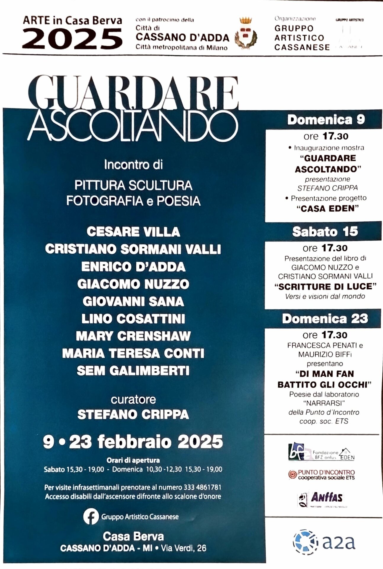 La rassegna “Arte a Casa Berva” apre il 2025 con “Guardare Ascoltando”, dal 9 al 23 febbraio, a Cassano d’Adda, in Via Verdi 26. Con il Patrocinio della Città di Cassano d’Adda e l’organizzazione del Gruppo Artistico Cassanese, curata da Stefano Crippa, “Guardare Ascoltando” è la mostra di un gruppo di artisti: