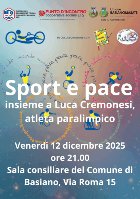 Un incontro per parlare di spor con chi ne è protagonista, ma guardandolo sotto una luce diversa. Questa la proposta lanciata dal circolo Acli di Masate e Basiano, promotore dell’iniziativa “Sport e pace” che si terrà venerdì 12 dicembre 2025 alle 21 presso la sala consiliare del Comune di Basiano in via Roma 11.
