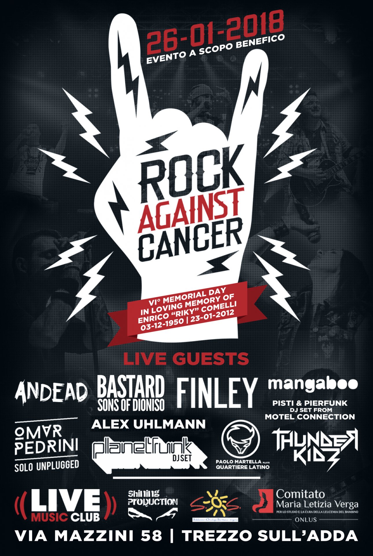 Nel corso della serata si esibiranno Alex Uhlmann (Planet Funk), frontman di una delle più importanti band del panorama elettro-dance italiano ed internazionale. La punk band milanese degli Andead, capitanata da Andrea Rock official (dj/speaker di Virgin Radio Italy). Ci saranno anche i The Bastard Sons of Dioniso con il loro nuovo inedito Cambogia.  Poi sarà la volta dei Finley che suoneranno il loro ultimo album Armstrong. Mangaboo è, invece, il nuovo progetto di Giulia Passera (The Sweet Life Society) e Francesco Pistoi (Motel Connection). Il diverso background musicale dei due musicisti li ha portati a sviluppare un sound assolutamente originale, che assimila e rielabora generi diversi. Omar Pedrini, presente con la sua chitarra,  suonerà suo nuovo album “Come se non ci fosse un domani”. I Quartiere Latino con Paolo martella proporranno una alchimia di diversi generi che spazia dal  Funky degli anni Settana, l’Hard rock degli Ottanta, l’Hip Hop e il Grunge. Immancabile, infine, la presenza dei Thunder Kidz. Una formazione “all stars” nata proprio in occasione della prima edizione di Rock against cancer. E’ composta da più elementi che si alternano sul palco e che ripropongono grandi classici della musica hard rock e non solo.