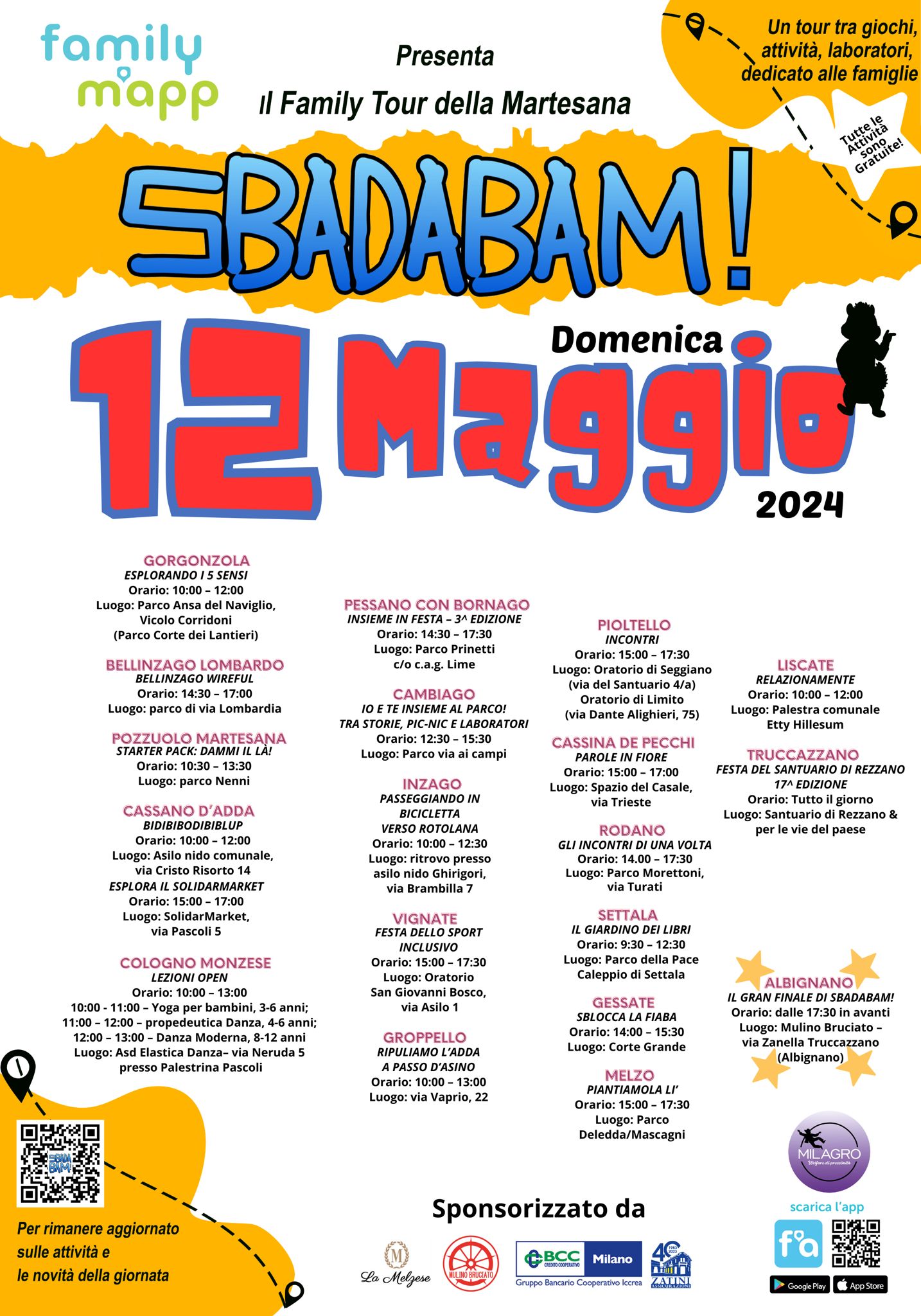 Diciotto i Comuni coinvolti, ma gli eventi e le iniziative sono molti di più. Domenica 12 maggio torna Sbadabam, il tour della Martesana a dimensione famiglia promosso dalla cooperativa Milagro nell’ambito del progetto Family M’App.