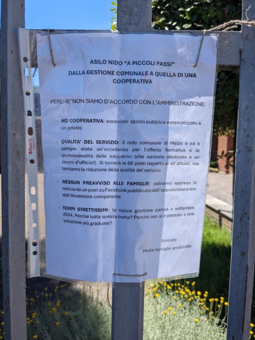 Nel weekend è andata in scena una protesta organizzata da alcuni genitori di bambini che utilizzano il servizio del nido comunale: hanno appeso striscioni fuori dai cancelli della scuola per ribadire la loro contrarietà e hanno pubblicato un volantino molto esplicito con un je accuse nei confronti dell’Amministrazione e dell’assessore all’Istruzione Massimo del Signore oltre che del sindaco, rei, a loro dire, di non aver mai interpellato le famiglie sulla questione e di non averli nemmeno avvisati ufficialmente.