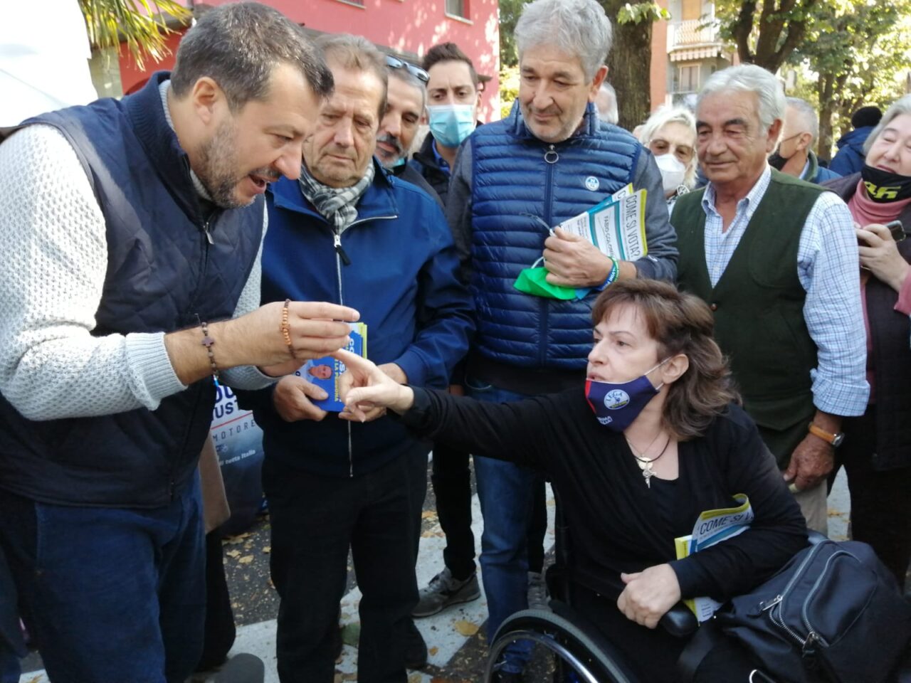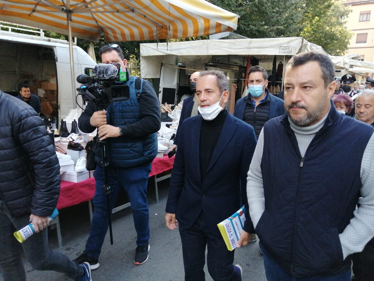 Il leader della Lega, oltre a stringere mani e a farsi i selfie con i passanti, è intervenuto davanti ai microfoni per parlare di Green pass e di tamponi.