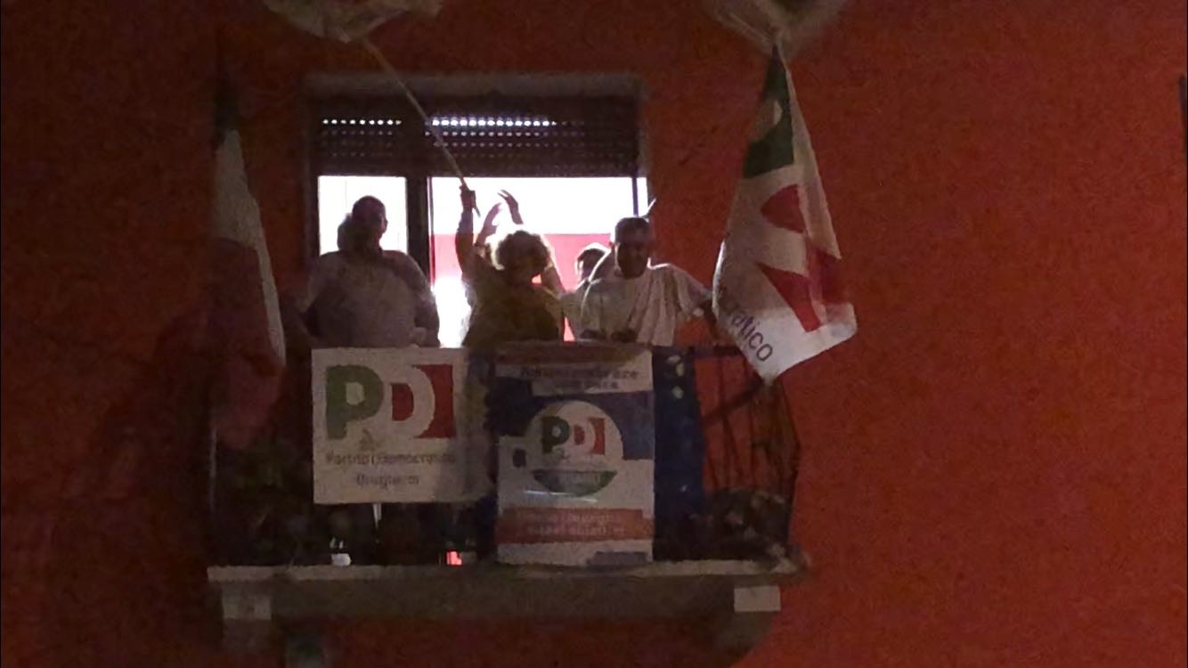 Non mancano gli sfottò. Dal balcone della sede Pd si alza il coro “Balconi chiama le Iene”, riferendosi alla vicenda del Piano del centro e al servizio della trasmissione di Mediaset.