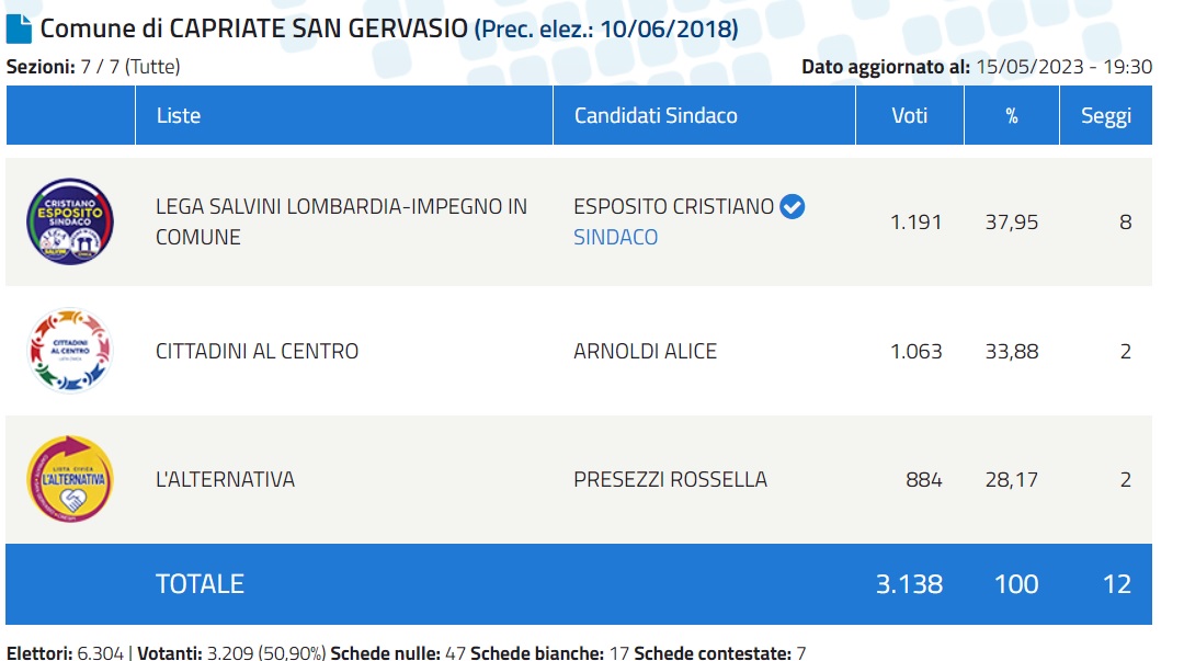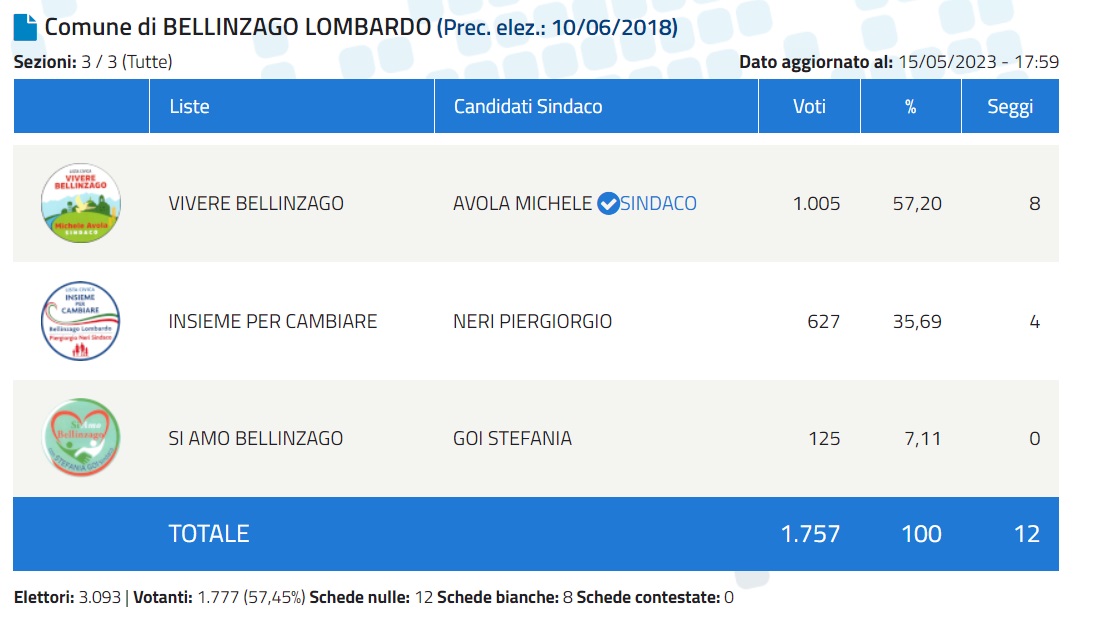 Il risultato è arrivato in poco tempo con il neo eletto sindaco che ha ottenuto il suo terzo pass verso la poltrona più importante del municipio. Il distacco della sua lista (a guida Lega) è stata di poco più di 100 voti dalla contendente più prossima.