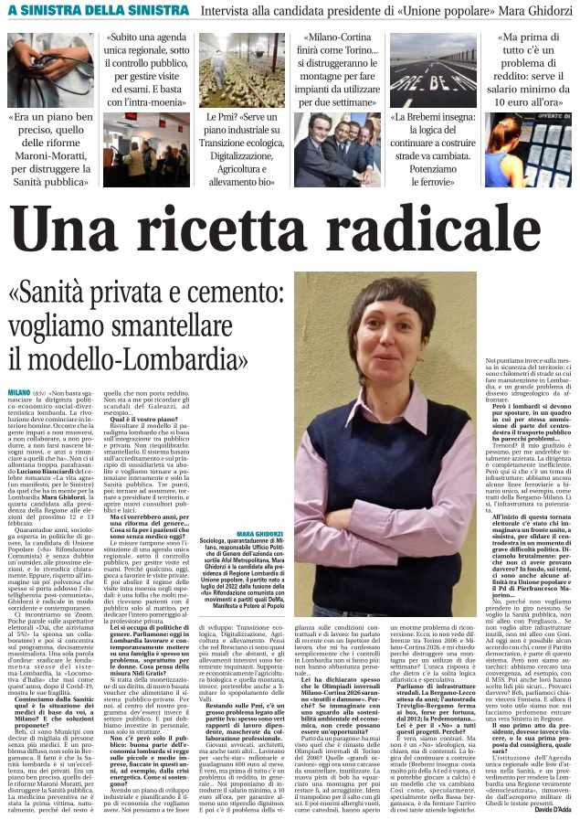 Ci incontriamo su Zoom. Poche parole sulle aspettative elettorali «Dai, che arriviamo al 5%!» la sprona un collaboratore) e poi si concentra sul programma, decisamente massimalista. Una sola parola d’ordine: sradicare le fondamenta stesse del sistema-Lombardia, la «Locomotiva d’Italia» che mai come quest’anno, dopo il Covid-19, mostra le sue fragilità.
