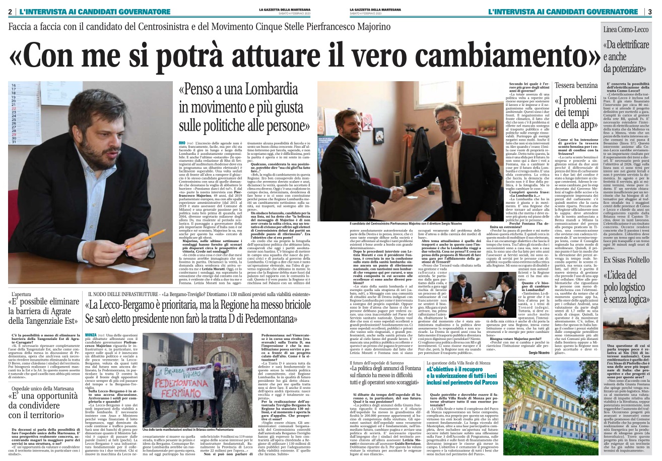 Io credo a una cosa e cioè che due mesi fa nessuno avrebbe immaginato che noi fossimo in partita. Diciamoci la verità, la domanda allora sembrava chi arriva secondo tra me e Letizia Moratti. Oggi, ce lo confermano i sondaggi, ma soprattutto la sensazione che emerge dal contatto con la gente, è evidente che è sfida a due tra me e Fontana. Letizia Moratti non ha oggettivamente alcuna possibilità di farcela e io sento un buon clima crescente. Fino all’ultimo lotteremo per farcela, sapendo, e non lo scopriamo oggi, che è difficilissima, però la partita è aperta e io mi sento in campo.