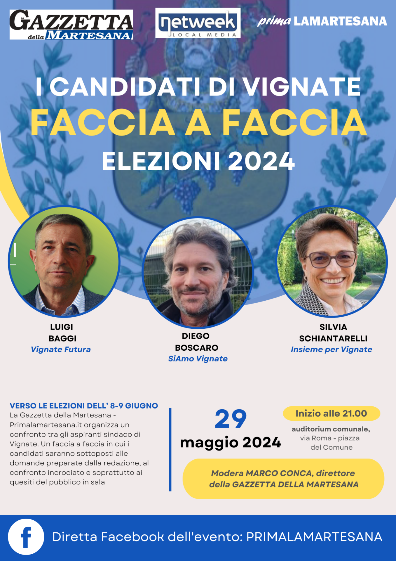 Per coloro che non potranno essere fisicamente presenti al confronto, l’intero evento sarà trasmesso in diretta sulla pagina Facebook Primalamartesana e sul nostro sito. Inoltre il video resterà a disposizione sempre sulla pagina Facebook anche per i giorni successivi, sempre nell’ottica di fornire informazione puntuale e di qualità ai cittadini di Vignate.