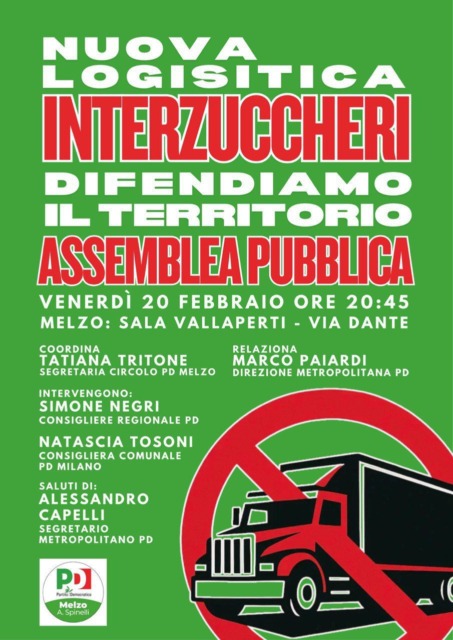 “Nuova logistica Interzuccheri”, difendiamo il territorio, questo il titolo della serata che lascia intuire quale sia la posizione dei dem. A coordinare l’incontro la segretaria cittadina Tatiana Tritone, con la relazione di Marco Paiardi, ex assessore melzese e membro della direzione metropolitana del Pd. Ospiti Simone Negri, consigliere regionale dei dem, la consigliera comunale di Milano Natascia Tosoni e il segretario metropolitano Alessandro Capelli.