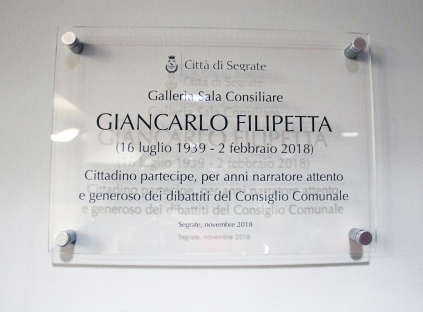Ieri sera, lunedì 17 dicembre 2018, momento speciale in apertura della seduta del Consiglio comunale. La galleria che porta all’aula consiliare è stata ufficialmente dedicata a Giancarlo Filipetta, cittadino segratese scomparso a febbraio di quest’anno. Tra ricordi e commozione, è stata scoperta la targa in sua memoria. Presenti i figli Marco e Laura e i nipoti.