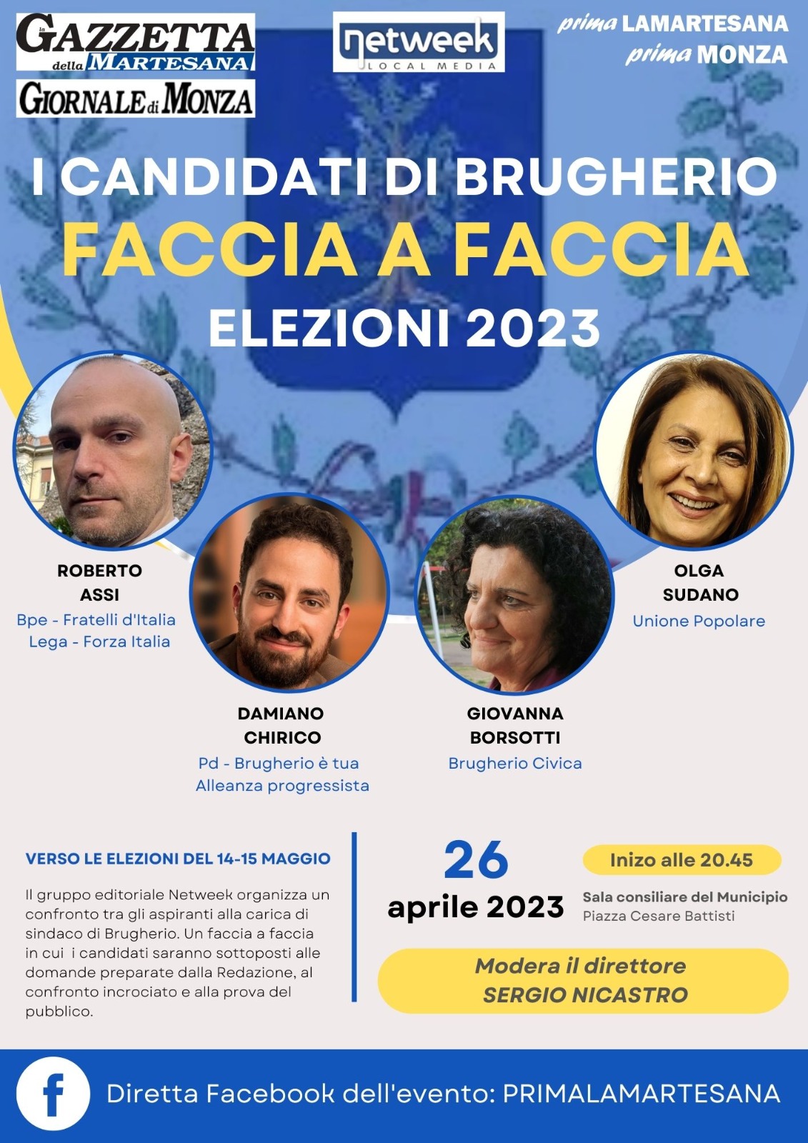 La Gazzetta della Martesana e il Giornale di Monza mettono i candidati alla carica di sindaco di Brugherio faccia a faccia, per permettere ai lettori e al pubblico della città di conoscere meglio e di valutare coloro che ambiscono a diventare primo cittadino. L’appuntamento è oggi, mercoledì 26 aprile 2023, alle 20.45 in sala consiliare.