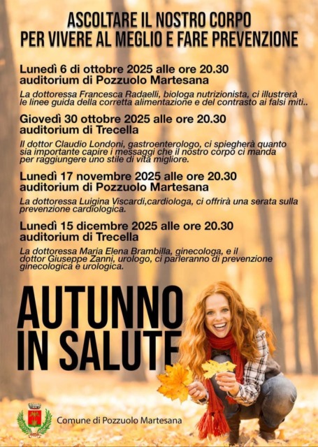 La rassegna, intitolata “Autunno in Salute – Ascoltare il nostro corpo per vivere al meglio e fare prevenzione”, si svolgerà tra ottobre e dicembre 2025, alternando le sedi dell’auditorium di Pozzuolo Martesana e dell’auditorium di Trecella.