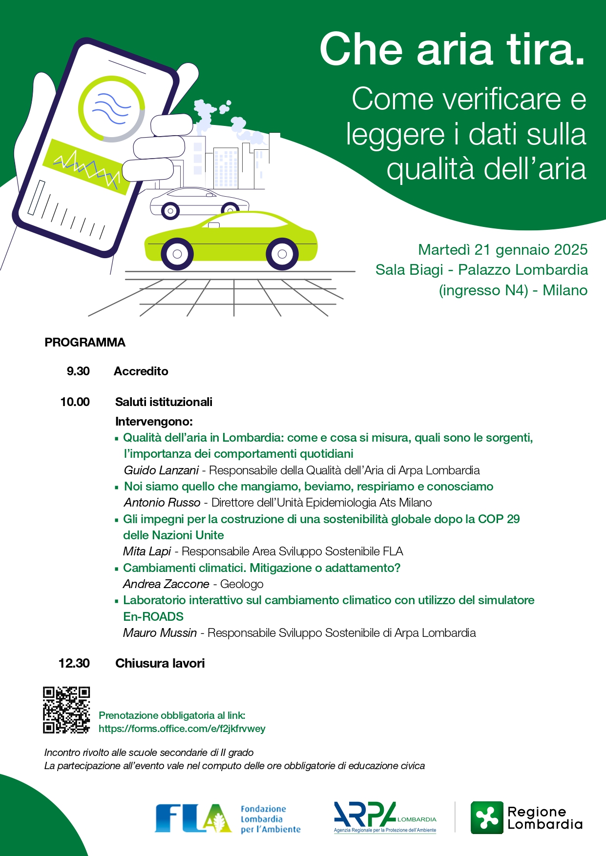 Dopo i saluti istituzionali di Romano La Russa, assessore alla Sicurezza e Protezione Civile di Regione Lombardia, di Lucia Lo Palo, presidente di Arpa Lombardia e di Fabio Cambielli, direttore generale di Arpa, interverranno sul tema Guido Lanzani, responsabile della Qualità dell’Aria di Arpa Lombardia, Antonio Russo, direttore dell’Unità Epidemiologia dell’Ats Milano, Mita Lapi, responsabile Area Sviluppo Sostenibile di Fla, il geologo Andrea Zaccone e Mauro Mussin, esperto ambientale di Arpa Lombardia e En-ROADS ambassador.