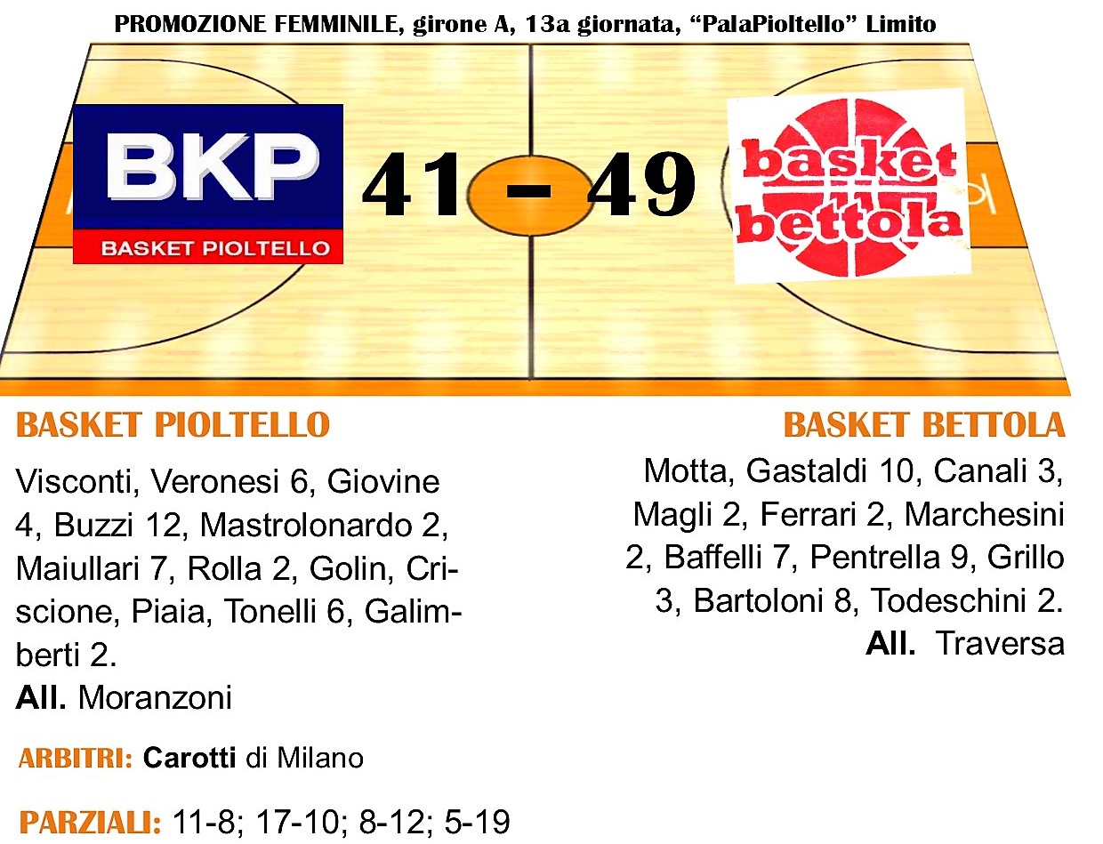 Rimonta a buon fine per il Basket Bettola. Ieri sera, nel posticipo della tredicesima giornata, la formazione di coach Traversa si è imposta per 41-49 in rimonta sul campo di Pioltello. Bettola è salita a quota 12 in classifica, piazzandosi momentaneamente all’ultimo posto utile per gli spareggi. Pioltello ha incassato la seconda sconfitta consecutiva dopo il ko di Dalmine.