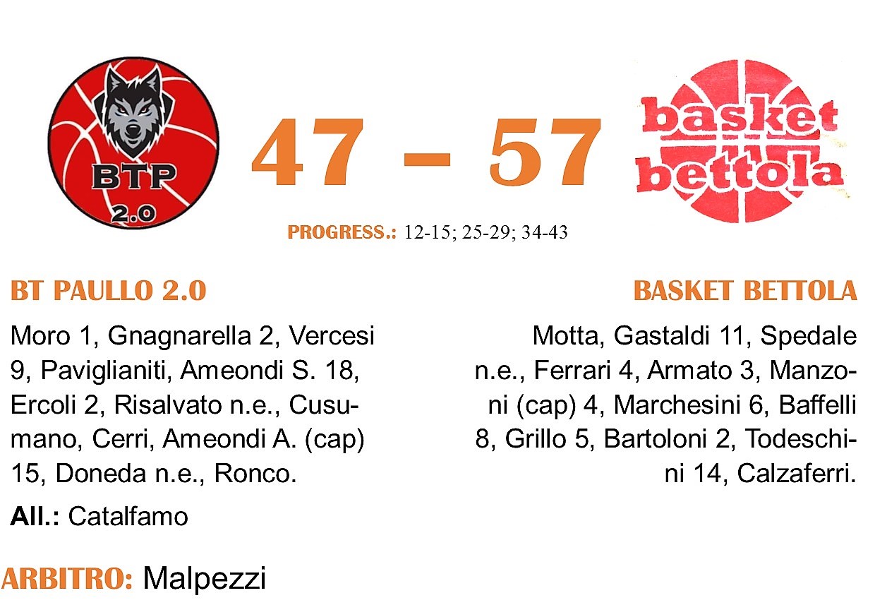 La partenza è stata equilibrata, ma a scattare con più brillantezza è stato il Bettola. Gastaldi ha aperto le marcature nel pitturato con i primi tre punti personali della serata (per la lunga saranno 11 alla sirena finale, conditi da 3 rimbalzi, 2 assist e 6 recuperi), supportata dalla solita Baffelli, che di qualità ha portato Bettola in vantaggio. Paullo, trascinata dalle due Ameondi, ha tentato di riscattare un avvio tentennante, ma Bettola ha assorbito il colpo e risposto nel finale con i punti di Marchesini. Nel secondo quarto, Paullo ha avuto la prima occasione per passare in vantaggio, ma dopo un avvio raggiante, Bettola è tornata in cattedra. Bartoloni, Todeschini e Armato hanno portato Bettola a +9 al 25’ e nel finale di quarto sono stati decisivi i due canestri di Grillo, che hanno portato Bettola alla pausa lunga con un vantaggio di 4 punti.