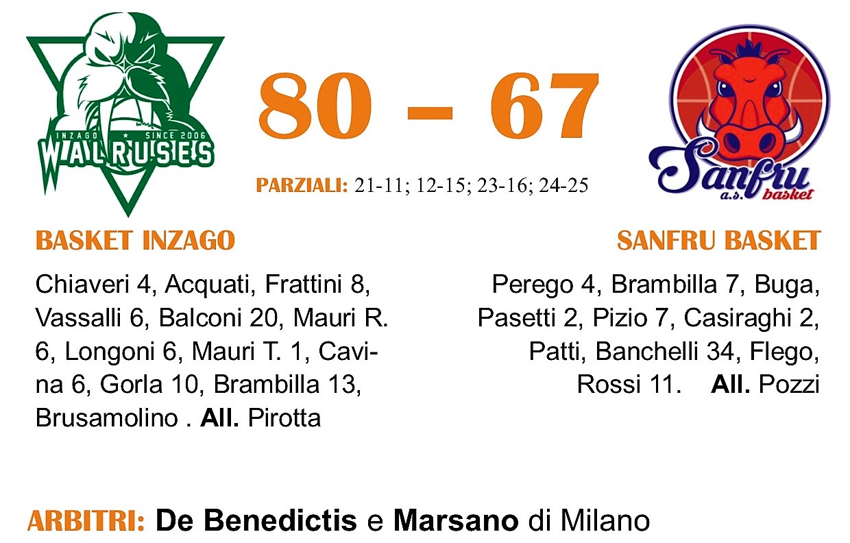 Fin dalle prime battute, Inzago è riuscita a imporre il proprio ritmo in campo e a referto. Longoni, Balconi e Cavina hanno aperto le marcature dalla media distanza, mentre a metà tempo le firme di Balconi e Riccardo Mauri sono state fondamentali per gettare le fondamenta del +10 che ha chiuso il primo quarto. Sanfru ha accorciato le distanze nel secondo periodo, grazie alle marcature di Banchelli e Rossi che nel pitturato hanno imposto il fisico riuscendo a rosicchiare a Inzago i punti necessari per annullare la doppia cifra di vantaggio al 20′ (33-26 alla pausa lunga).